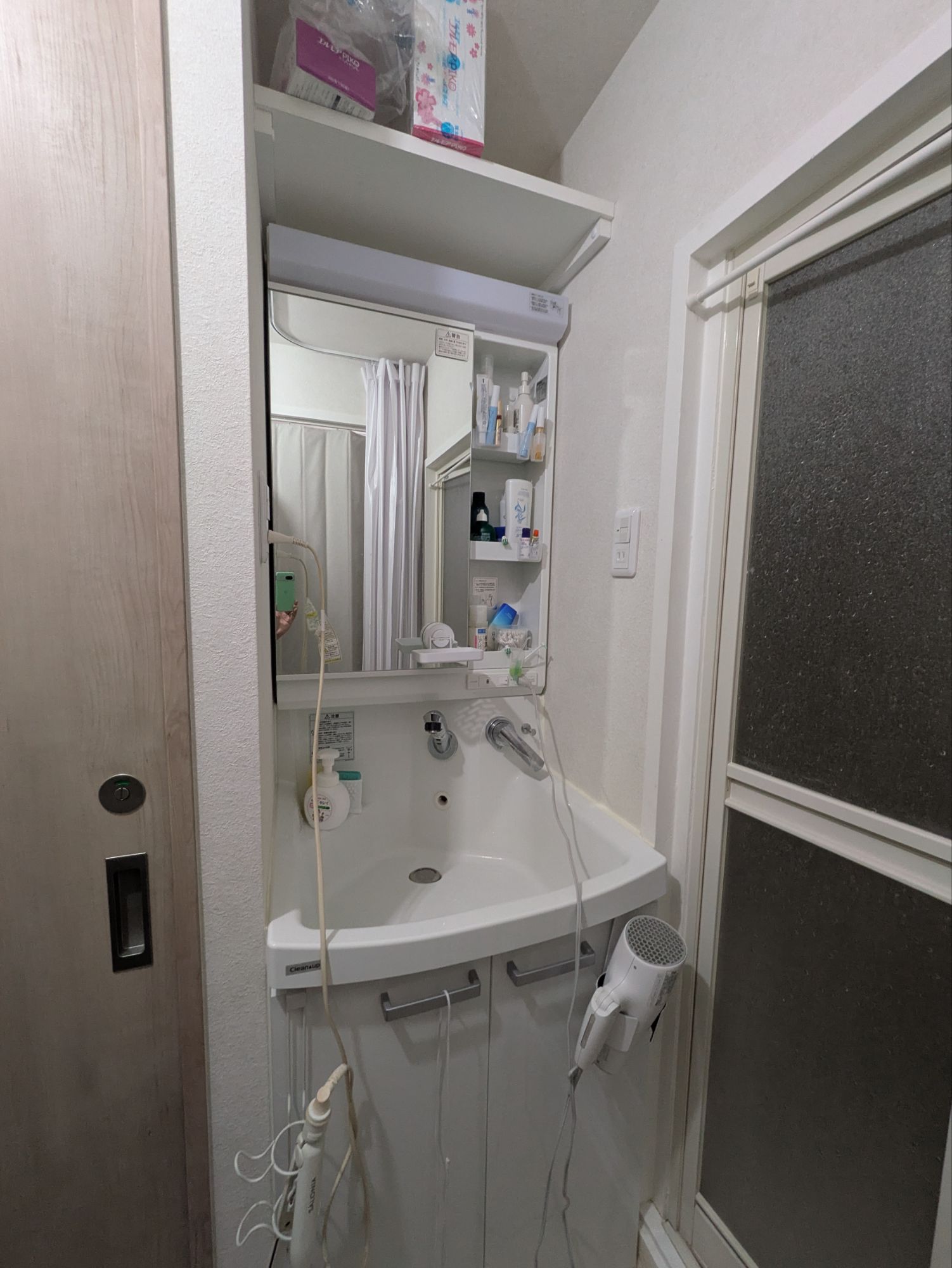 鏡の中にもコンセントがあり、電動歯ブラシとジェットウォッシャーを充電しています。(賃貸の洗面台には中々無い)