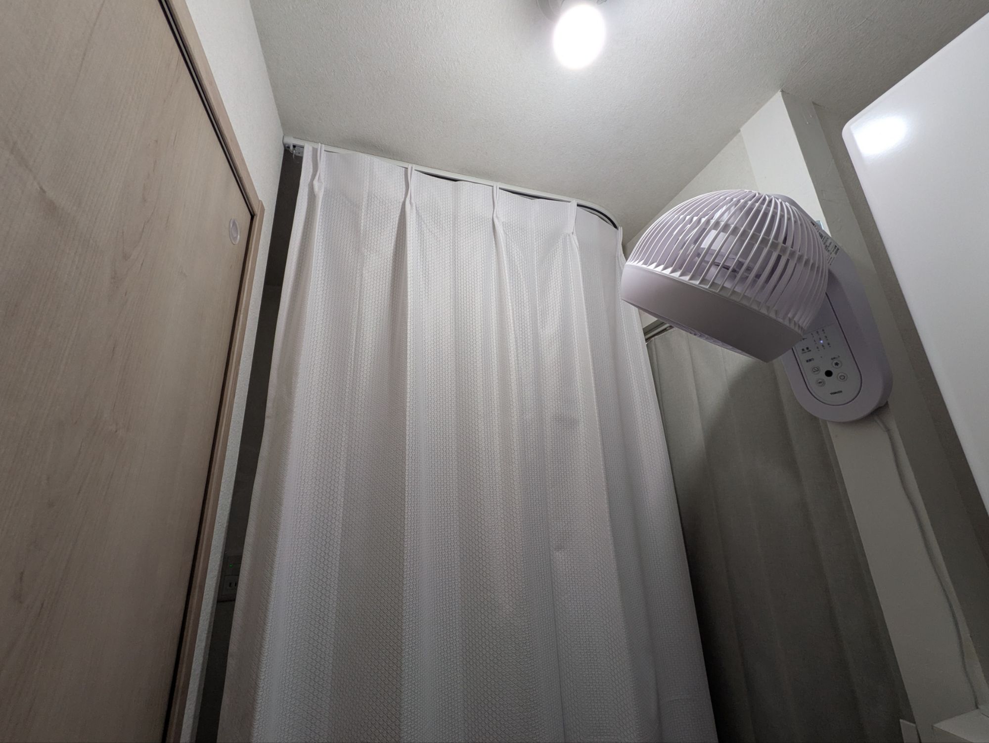こんな感じにカーテンを閉めると軽く目隠しできます。(トイレ行った後洗面台使いにくくはなる)
